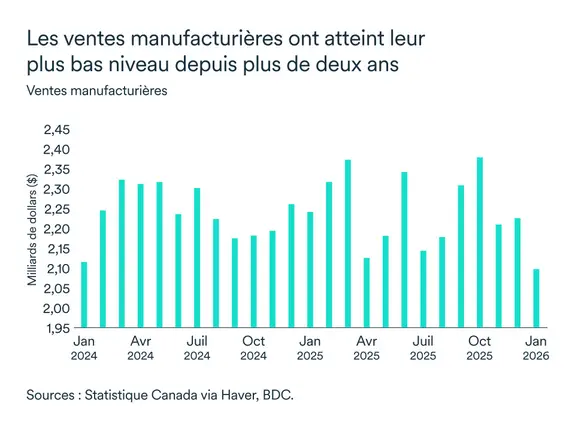 Les expéditions du secteur manufacturier restent sous pression. Les ventes du secteur manufacturier ont reculé de 8 % en janvier par rapport à l'année dernière. Cette faiblesse reflète le ralentissement économique qui a frappé la province à la suite de l'imposition de droits de douane, principalement sur les produits agricoles. L'industrie agroalimentaire représente près d'un tiers du total des ventes manufacturières de la province. La fabrication de produits à base de céréales et d'oléagineux a reculé de 10,1 %, en raison principalement de la baisse des prix de l'huile et de la farine de canola. Mais la demande chinoise devrait soutenir la hausse des prix, maintenant que de nombreux droits de douane visant le secteur agroalimentaire canadien ont été levés.