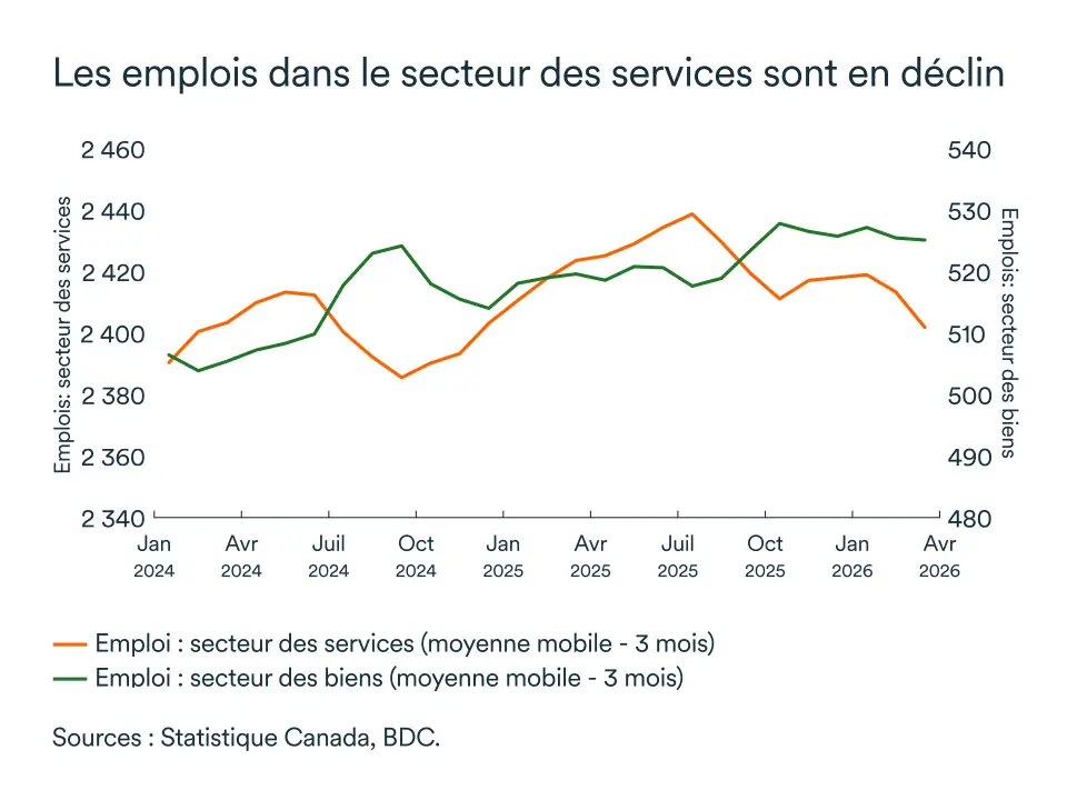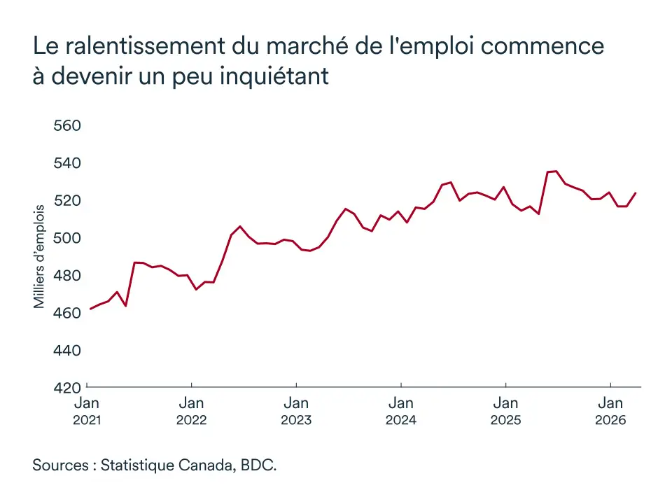 L'emploi s'est affaibli au premier trimestre de 2026, avec une perte de près de 3 000 emplois. La plupart de ces pertes ont été enregistrées au cours des deux premiers mois de l'année. Il y a moins de création d’emplois depuis 2024, une tendance qui correspond au ralentissement de la croissance économique observé en 2025. Les prochaines données permettront d'évaluer cette tendance qui commence à devenir légèrement préoccupante.