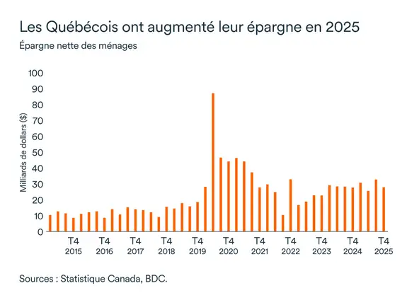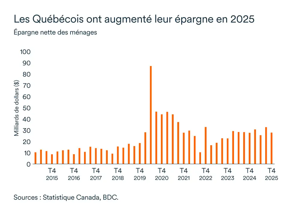 L’épargne des ménages a augmenté en 2025, dans un contexte de ralentissement économique. Un marché du travail solide et une croissance salariale plus rapide ont aidé les Québécois à se constituer une réserve sécuritaire. Cependant, devant l’incertitude persistante, le marché immobilier est resté sous pression pendant la majeure partie de la dernière année et au début de 2026. Malgré une légère hausse des ventes de maisons en février, une tendance à la hausse se fait encore attendre.