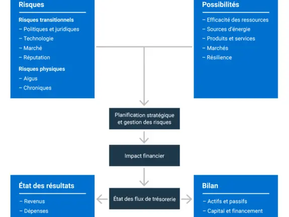 Le tableau ci-dessous permet de comprendre rapidement comment les risques et les possibilités liés au climat peuvent interagir avec vos revenus, vos dépenses, vos actifs et vos passifs, ainsi que vos capitaux et votre financement.