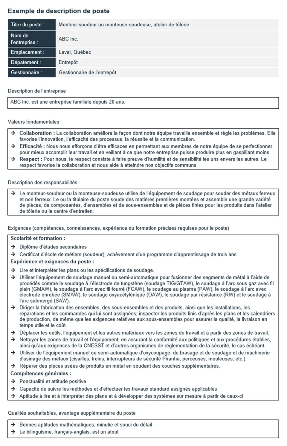 L’exemple suivant a été créé à l’aide de la ressource gratuite Modèle de description de poste de BDC