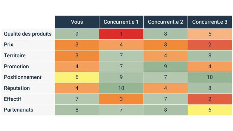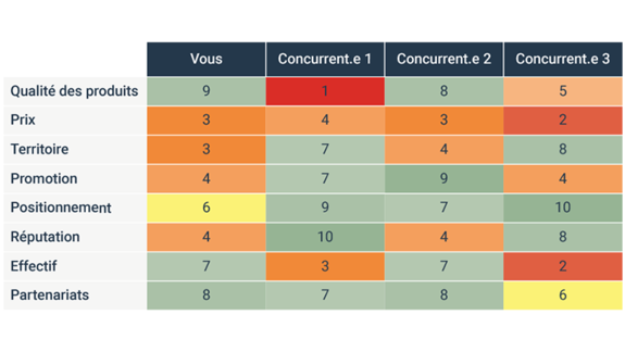 Durant la séance de deux heures avec votre équipe, il est important que vous puissiez facilement comparer les performances de entreprises concurrentes avec les vôtres. Mallika Kazim suggère de commencer par noter vos entreprises concurrentes sur une échelle de 1 à 10, en fonction des critères cités ci-dessus, en utilisant une simple grille ou un tableau dont voici un exemple: