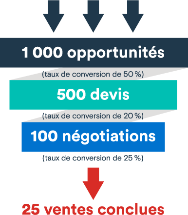Une astuce consiste à considérer votre entonnoir des ventes comme une pyramide inversée. Si 50 % de vos clientes et clients susceptibles passent à l’étape du devis, 20 % à celle des négociations et 25 % concluent une vente, alors vous savez que vous devez parler à 1000 clientes et clients susceptibles pour vendre 25 unités.