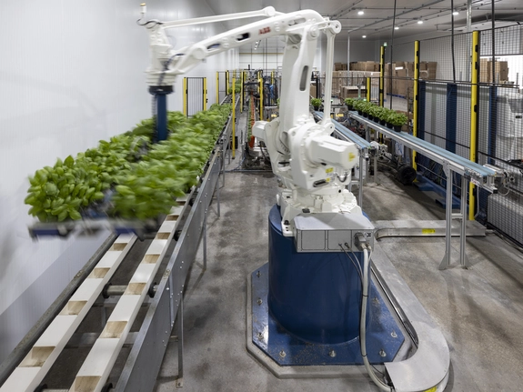 Bien que l’étape de l’ensemencement des plants de basilic était déjà automatisée, les membres du personnel devaient encore placer les jeunes plants sur un plateau, puis les déplacer dans différentes sections des serres à chaque étape de croissance subséquente. Au moment de la récolte, il fallait se déplacer dans la serre pour cueillir les plants, les emballer un à un et les transporter ensuite jusqu’à un poste de travail où d’autres personnes s’occupaient de la mise en caisse.