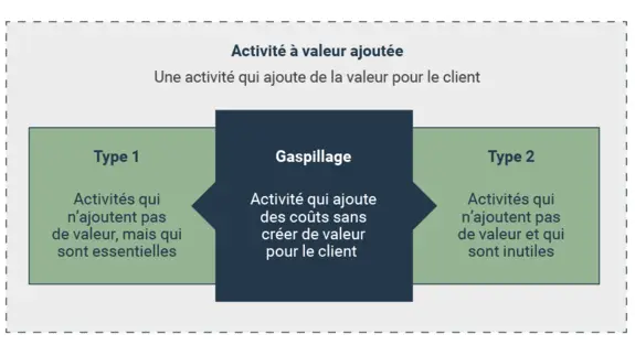 Il ne s’agit pas des déchets qui vont à la poubelle, mais plutôt des efforts, du temps et des ressources gaspillés. Le gaspillage concerne toute chose qui n’apporte pas de valeur ajoutée et pour laquelle la clientèle ne paiera pas. La production à valeur ajoutée se concentre particulièrement sur la lutte contre le gaspillage.