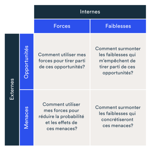 Quant aux opportunités et aux menaces, elles renvoient généralement aux changements qui se produisent dans votre marché ou dans le monde en général et qui peuvent représenter des facteurs positifs ou négatifs pour votre entreprise.