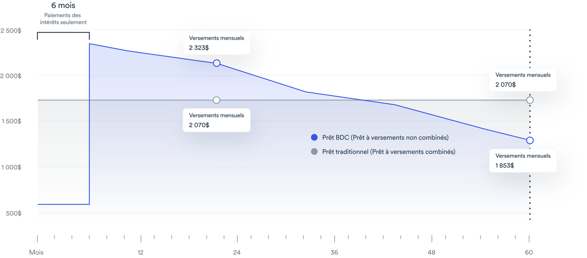 Ce graphique vous montre comment vos versements peuvent diminuer au fil du temps, ce qui vous aide à améliorer votre flux de trésorerie.